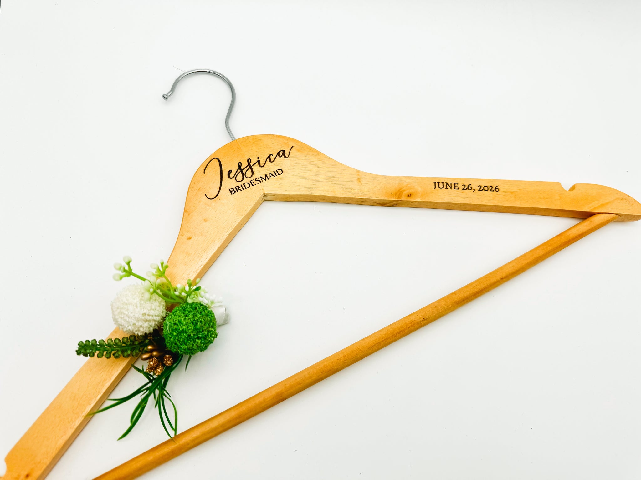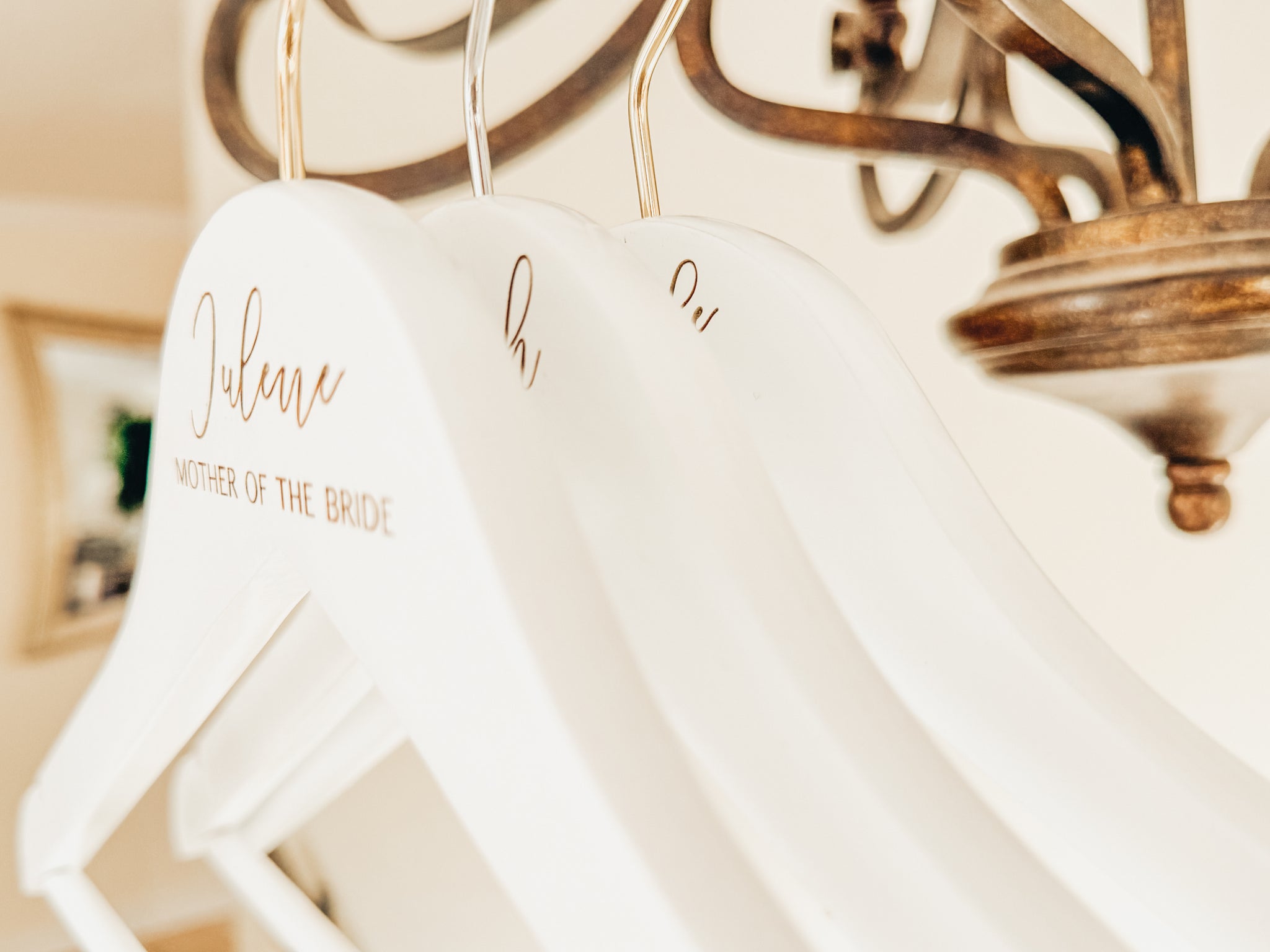 The morning light spills softly into the room, casting a gentle glow over everything. It’s the calm before the day you’ve dreamed of begins. You glance toward the dress or suit that will soon carry you down the aisle. But there’s something extra special holding it up—an elegant, personalized hanger, engraved just for this moment.